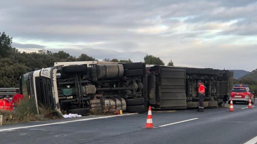 El camión transportaba carga de pan congelado. El accidente ha obligado a cortar un carril en sentido Pamplona. Patrullas de tráfico de la Policía Foral han quedado regulando el tráfico y equipos de atestados realizan las diligencias. También se han desplazado al lugar bomberos y una ambulancia.