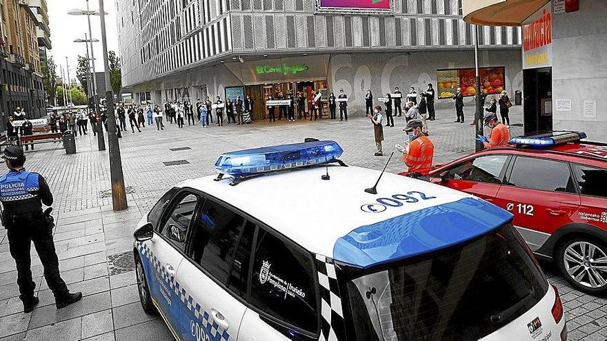 Trabajadores del sector de la alimentación y miembros de las fuerzas de seguridad se rindieron ayer un muto reconocimiento por la labor que están desempeñando durante el estado de alarma. Los aplausos en balcones, ventanas y hospitales tuvieron ayer otro punto de encuentro en el centro de Pamplona, junto a El Corte Inglés, donde se citaron trabajadores de este centro y representantes de Guardia Civil y Policía Nacional, Foral y Municipal, a los que desde una vivienda se unió la música en homenaje a los fallecidos.
