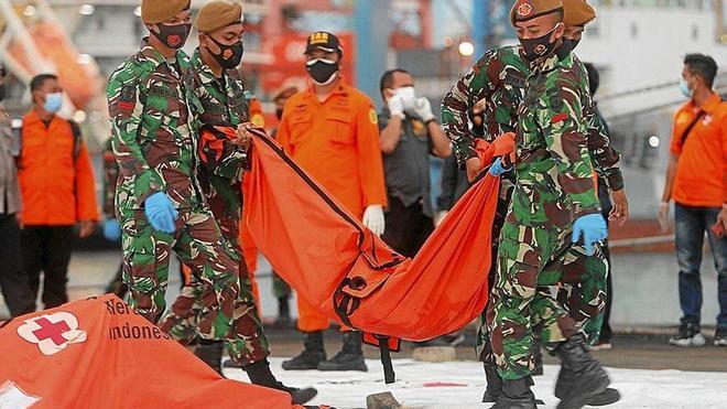 Soldados indonesios portan una bolsa para cadáveres en el puerto de Tanjung Priok en Yakarta, Indonesia. Las autoridades indonesias continúan con la búsqueda de restos de las víctimas y de las cajas negras del avión de la aerolínea Sriwajaya que se estrelló contra el mar con 62 personas a bordo. Los forenses identificaron ayer a la primera víctima mortal, a Okky Bisma, un azafato de 29 años. Mientras, los equipos de rescate trabajan contra reloj para encontrar pruebas que identifiquen a las víctimas y expliquen las causas del accidente.