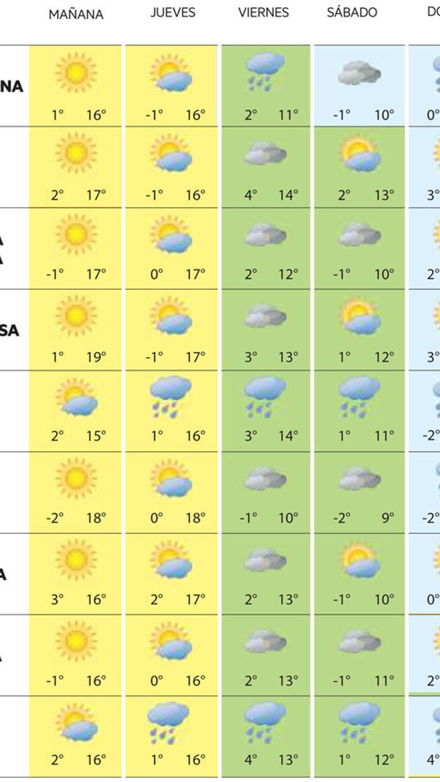Viernes: Nuboso o cubierto tendiendo a abrir claros por la tarde en el centro y sureste. No se descartan brumas o bancos de niebla en zonas altas del norte y oeste al principio y al final del día. Lluvias débiles en el noroeste y Pirineos, con probabilidad baja de que se extiendan por el resto de la mitad norte. Temperaturas mínimas en ascenso y máximas en descenso. Heladas débiles y dispersas en Pirineos. Viento flojo del noroeste, más intenso en el sureste en horas centrales.