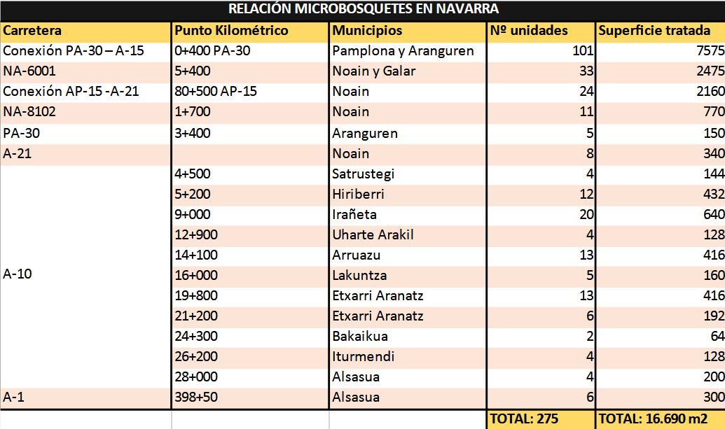Fundamentalmente, "se trata de mejorar la fertilidad de la tierra de pequeñas superficies en terrenos anejos a las carreteras navarras para su plantación con especies vegetales propias de la zona y propiciar así su mantenimiento de manera ecológica y sostenible", indican desde Cohesión Territorial. Dentro del programa Microbosquetes, impulsado por la Dirección General de Obras Públicas e Infraestructuras, se trabaja "con el objetivo de extender su implementación a la totalidad de la Red de Carreteras de Navarra".