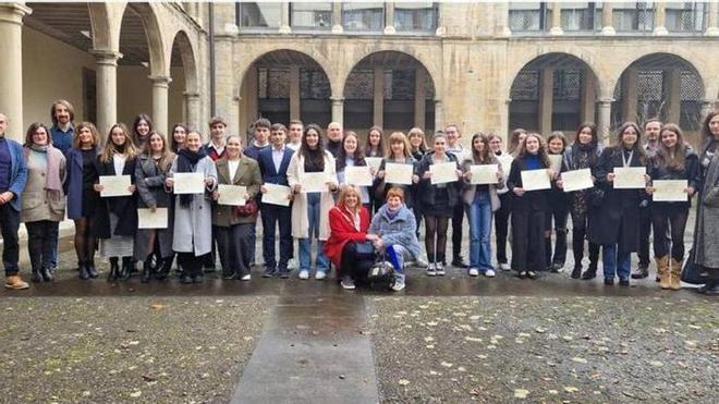Una treintena de alumnas y alumnos de los centros educativos navarros IES Benjamín de Tudela y Colegio San Cernin de Pamplona / Iruña han recibido esta mañana los diplomas Bachibac 2023-2024 en el transcurso de un acto celebrado en la sede del Departamento de Educación.