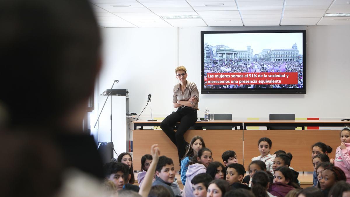 María Chivite se ha dirigido este mediodía al alumnado de 6º de Educación Primaria, donde ha hecho un repaso de la trayectoria de la mujer en la política. Durante su intervención, ha indicado que desde 1931, año en el que las mujeres pudieron votar en España por primera vez, se ha avanzado mucho, pero aún falta mucho camino por recorrer. "En España, de las 17 comunidades autónomas sólo 5 están gobernadas por mujeres. Además, en toda la democracia, sólo 15 mujeres han sido presidentas de comunidades autónomas", ha explicado.