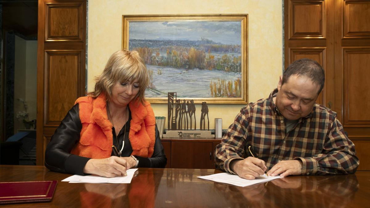 La vicepresidenta y consejera de Memoria y Convivencia, Acción Exterior y Euskera, Ana Ollo, y el director de Topagunea, Oskar Zapata, han firmado hoy el convenio de colaboración establecido entre el departamento y la entidad con el objetivo de reforzar el uso social del euskera en Navarra, sobre todo entre jóvenes. En la firma, la vicepresidenta ha estado acompañada por el director gerente de Euskarabidea, Jabi Arakama. El acuerdo, dotado con 155.000 euros, posibilitará el desarrollo del programa Euskarak 365 egun y el diseño de Euskaraldia, entre otros.
