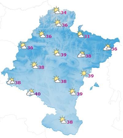 Navarra actualiza alertas y el aviso será también naranja para este fin de semana, cuando se rozarán máximas de 40ºC en varios puntos. Así, los termómetros marcarán extremos este viernes en Estella-Lizarra de 15 y 33 grados, en Pamplona/Iruña entre 16 y 31, en Roncal de 14 a 34 y en Tudela entre 18 y 36 grados.