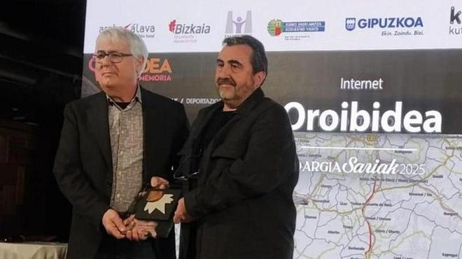 El archivo digital y Lugar de Memoria Oroibidea, del Centro de Documentación del Instituto Navarro de la Memoria (INM), ha sido reconocido en la categoría de Internet en la gala "Argia Sariak 2025, en la que el semanario en euskera más veterano ha repartido sus premios anuales en comunicación. Así, además del reconocimiento público, celebrado en la tarde de ayer, viernes 31 de enero, todos los proyectos premiados recibieron una escultura obra de artista donostiarra Antton Mendizabal durante la gala de entrega, que tuvo lugar en Atxega Jauregia (palacio Atxega) de la localidad gipuzkoana de Usurbil.