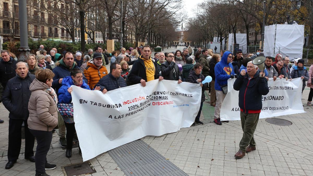 Familias de personas con discapacidad intelectual usuarias del servicio de transporte de Tasubinsa se han concentrado este jueves frente al Parlamento de Navarra para pedir que se cubra el coste del transporte para los centros ocupacionales.