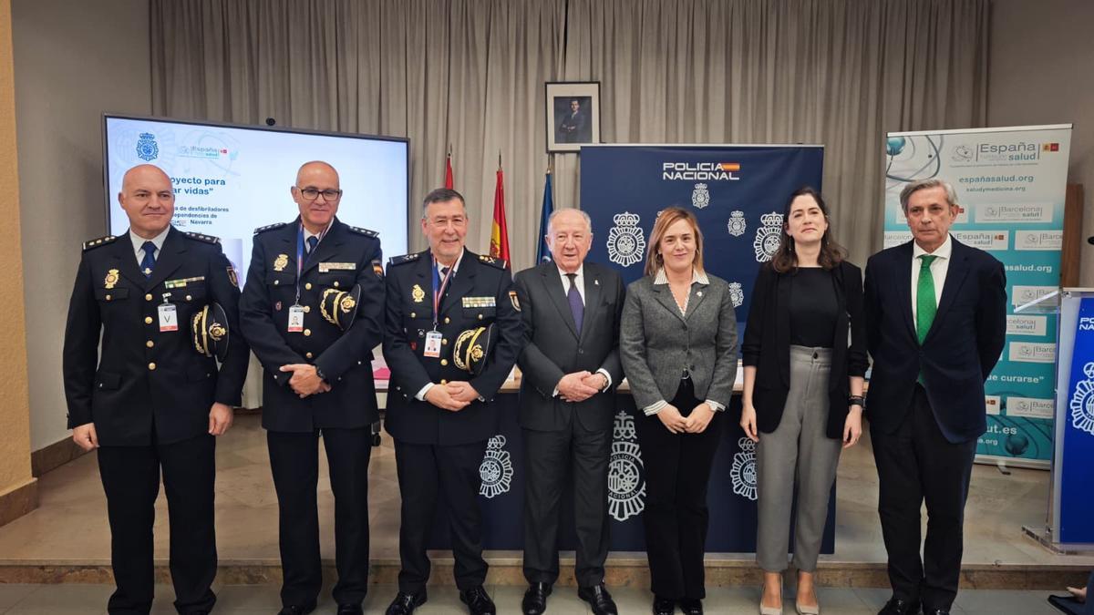 La delegada del Gobierno en Navarra, Alicia Echeverría, el jefe superior de Policía, Manuel Jesús del Collado, y los responsables de la Fundación España Salud han presentado el proyecto de cardioprotección de las dependencias de la Policía Nacional en Navarra, que contempla la instalación de desfibriladores de última generación para atender posibles episodios cardíacos sobrevenidos.