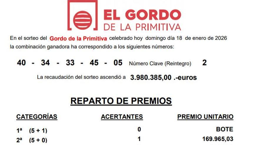 En el sorteo del Gordo de la Primitiva, la combinación ganadora ha correspondido a los siguientes números: 40-34-33-45-05 (reintegro, 2). La recaudación del sorteo ascendió a 3.980.385,000 euros. De Primera Categoría (5+1) no existen boletos acertantes, por lo que, con el bote generado que se pondrá en juego en el sorteo de El Gordo de la Primitiva del próximo domingo, un único acertante podría ganar 15.500.000,00 euros. De Segunda Categoría (5+0) existe un único boleto acertante, que ha sido validado en el Despacho Receptor Nº 62.300 de Berriozar, situado en Plaza Donantes de Navarra, 3.