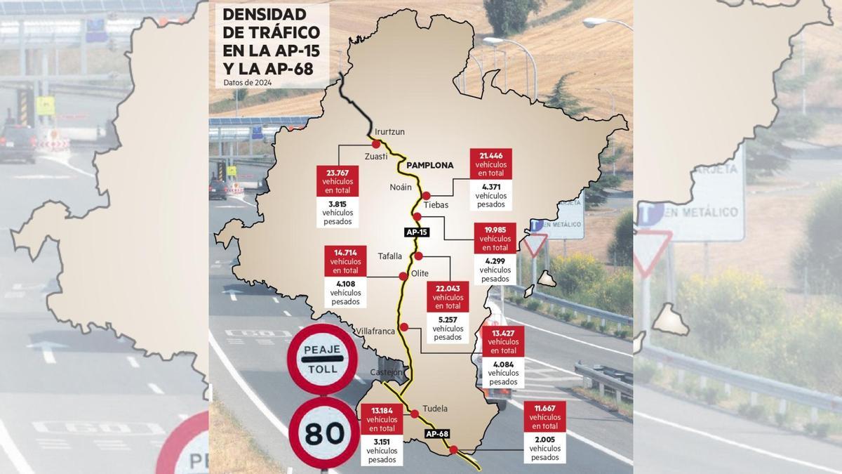 La próxima gratuidad del tramo de la Autopista Vasco-Aragonesa (AP-68), a partir de noviembre de este año, y la más futurible de la AP-15 en 2029, tal y como ha anunciado esta semana el portavoz del Gobierno de Navarra, Javier Remírez, repercutirá sobre los bolsillos de miles de usuarios de las dos únicas vías de pago en la Comunidad Foral. Según los últimos datos de aforos disponibles del Gobierno de Navarra, unos 10.000 vehículos ligeros utilizan a diario la AP-68 y otros 20.000 recorren la AP-15, unas cifras que previsiblemente aumentarán con la exención de pago. al atraer tráfico de sus alternativas gratuitas actuales, entre ellas la carretera N-121.