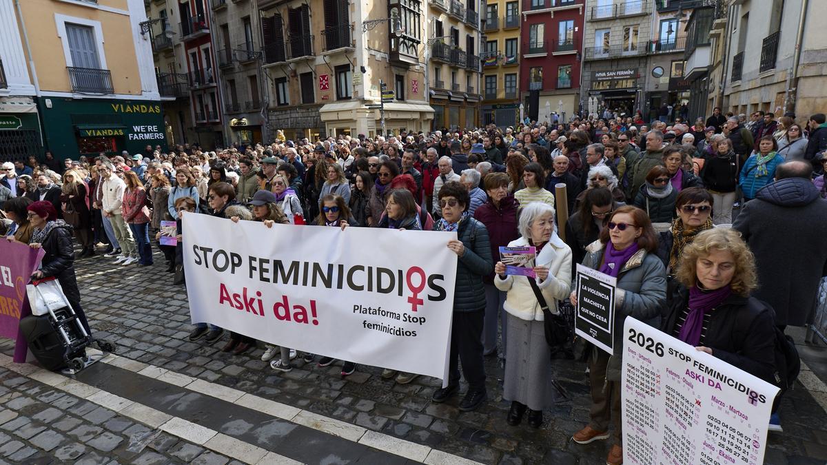 La movilización ha sido convocada por la plataforma de mujeres contra la violencia sexista de Navarra y se ha desarrollado en silencio durante 15 minutos hasta el sonido de las campanas. En este momento, Iratxe Álvarez y Kenia Cordero, en representación de la plataforma, han leído un comunicado que ha finalizado con los aplausos de los asistentes y algún grito de 'No son arrebatos, son asesinatos'.