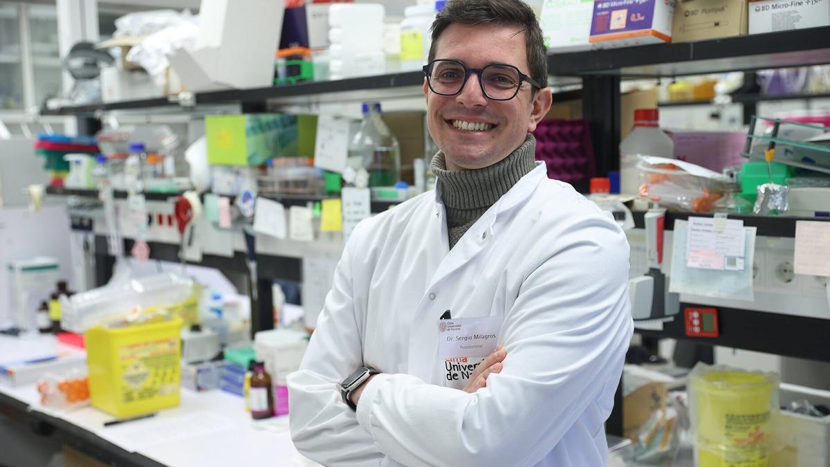 Cuando Sergio Milagros se sienta en su silla en uno de los laboratorios del CIMA –rodeado de botes, tubos de ensayo, pruebas de distinta índole y miles de post-it– lo hace como investigador en terapia génica renal pero también como paciente. Y es que Sergio, vecino de Pamplona de 28 años, padece hipomagnesemia familiar con hipercalciuria y nefrocalcinosis, una enfermedad rara –también llamada síndrome de Michaelis-Manz–, que provoca que los riñones no sean capaces de absorber el magnesio, el calcio y el fósforo, provocando calcificaciones que degeneran en una disfunción renal.