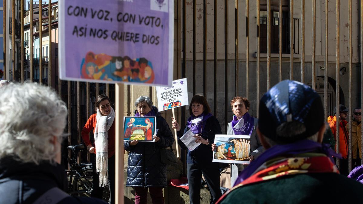 La acción de Pamplona se ha celebrado de forma simultánea en 35 territorios del Estado para criticar que, "a pesar de ser el corazón y las manos de la comunidad cristiana, las mujeres siguen excluidas del voto y de los espacios de liderazgo, una realidad que vuelve a quedar patente en los procesos sinodales actuales".