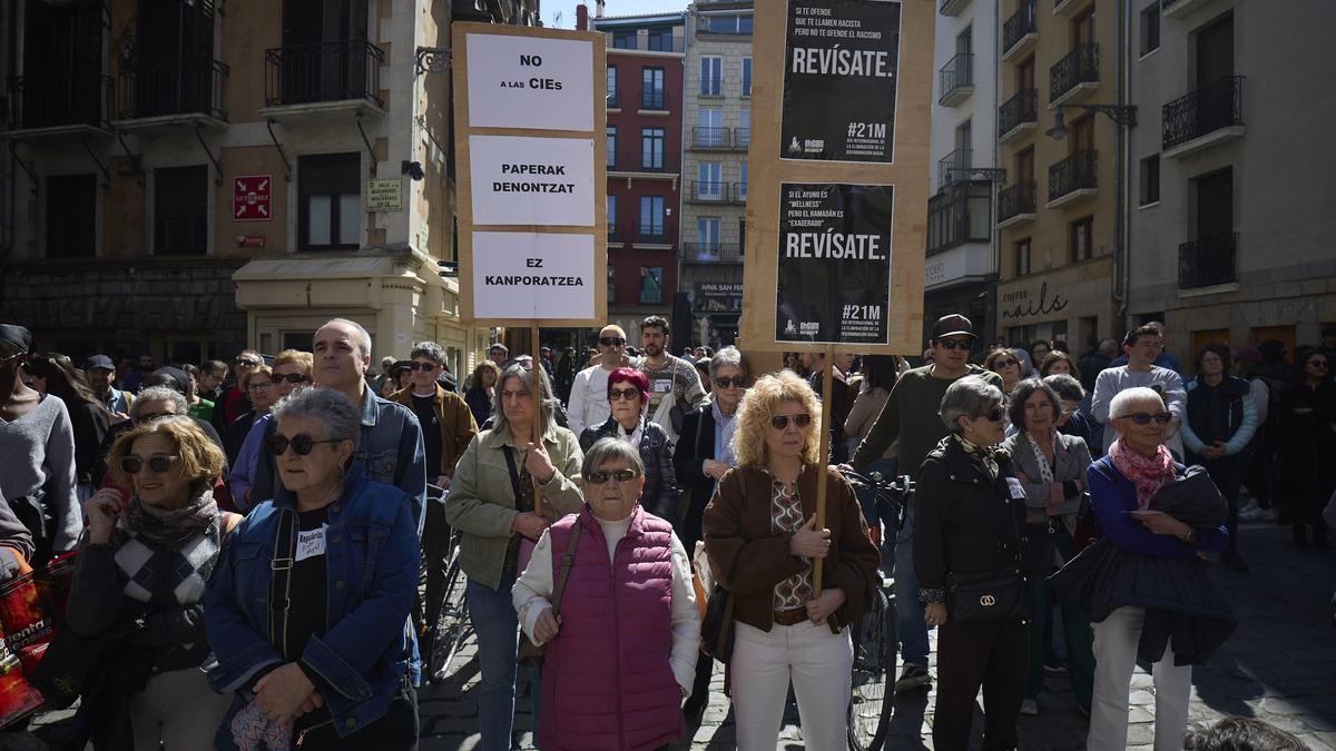 Una manifestación en Pamplona ha llamado este sábado a "tejer redes" y "cerrar filas frente al racismo" y ha advertido ante la "extensión de discursos de odio" que "utilizan a las personas migrantes, racializadas y gitanas como chivos expiatorios de problemas estructurales".