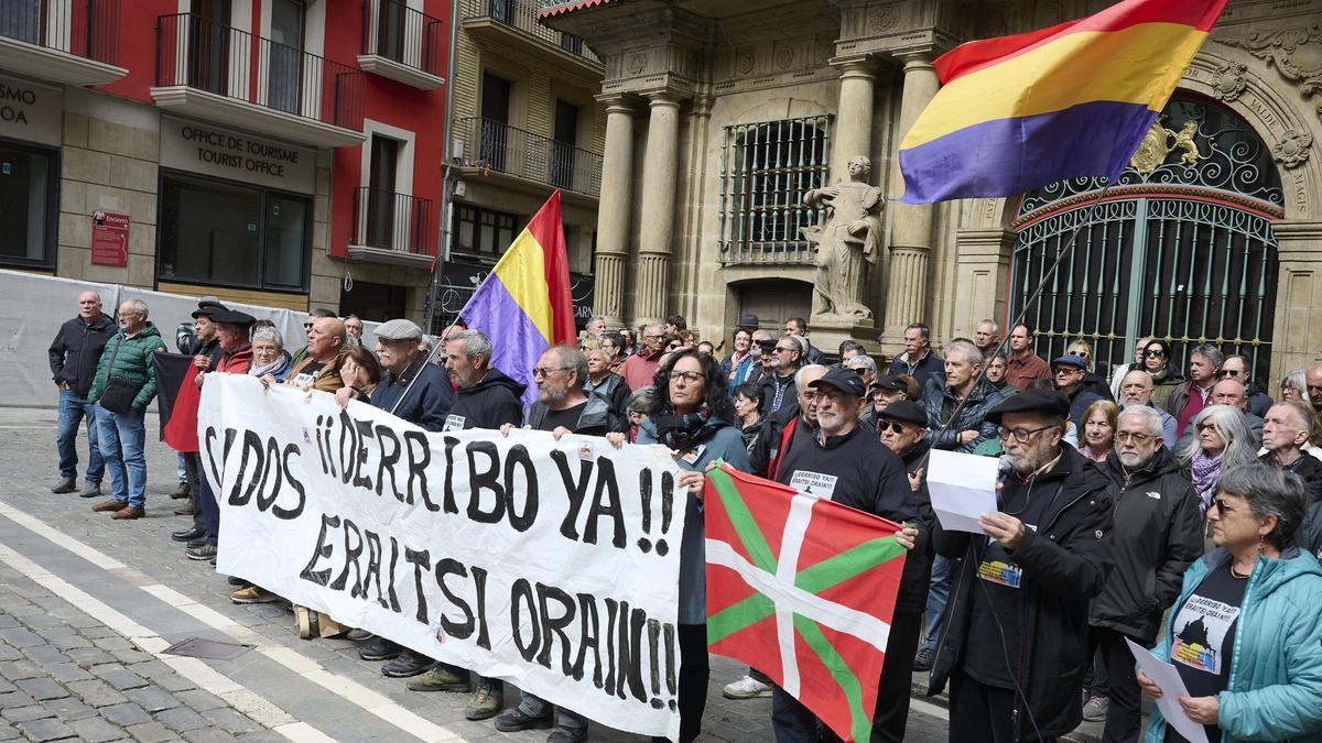 Encabezados por una pancarta en la que se leía 'Los Caídos. Derribo ya. Eraitsi Orain' y exhibiendo algunas banderas republicanas, han reiterado su demanda del derribo de "ese monumento al terror", subrayando que "no está protegido y por tanto no hay problema para derribarlo". Al respecto han apuntado que UPN adoptó en acuerdo en 2002 para protegerlo pero "lo publicó mal y por eso no está protegido".