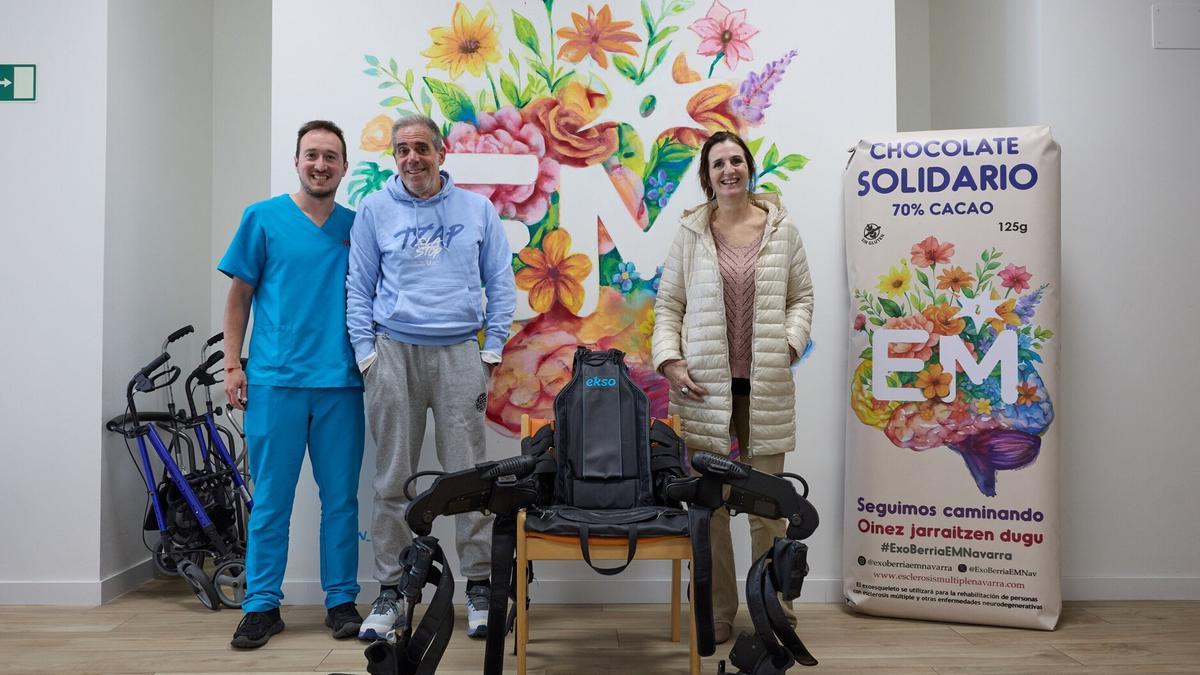 Pero para llegar hasta este punto, la asociación necesitaba de la solidaridad y humanidad que tanto les caracteriza y que, de una forma u otra, han contagiado a todos cuantos colaboran con ellos. Así, Txus Iborra –al frente de Chocolates Nakoa–, les presentó la “campaña perfecta”: vender chocolates solidarios para poder sufragar el coste del exoesqueleto y su mantenimiento, alrededor de 150.000 euros. “Se sumaron muchas personas, empresas e instituciones. Lo acogieron con muchísima ilusión”, cuentan. Y destacan que es una acción que agradecer “porque ellos no ganan nada, todo está destinado al beneficio de la asociación”. Y lo mismo ocurre con los puntos de venta –ya hay 80 en Navarra–. Gracias a ese primer gesto, alrededor de 100 usuarios de la asociación han podido probar el exoesqueleto, que ahora hay que renovar, y mejorar algunos de los diagnósticos provocados por la enfermedad. “Estamos hablando de que una de cada cuatro personas que vienen a este servicio ha probado el exoesqueleto en algún momento”, indica Javi Cotelo, fisioterapeuta que lleva nueve años trabajando en EM Navarra. En lo que respecta a los usuarios que pueden aprovecharse de esta herramienta, son personas que “tienen que poder ponerse de pie, aunque no tienen por qué andar, pero no pueden tener una espasticidad, ni infecciones activas, ni tumores, ni riesgo de osteoporosis grave. Y tampoco tendría sentido la herramienta si la enfermedad todavía no ha pasado por ellos desde el punto de vista físico”, explica. El exoesqueleto reproduce una marcha “perfecta” con el objetivo de que, quienes caminan, se beneficien de esa forma de andar distinta a la que ya tienen interiorizada y que, quienes no dan pasos en su día a día, “puedan caminar un poco, estar erguidos y de pie, que eso tiene grandes beneficios circulatorios porque, por lo general están sentados y no mueven la sangre. Para mejorar el andar, hay que correr. Y para ponerse de pie, hay que andar”, añade.