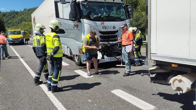 El conductor de uno de los camiones tuvo que ser evacuado con heridas leves como un latigazo cervical y contusión en el tórax. Hasta el lugar acudieron bomberos del parque de Oronoz, que siguen trabajando en la zona, una ambulancia de soporte vital básico y la Policía Foral que se encarga de las diligencias del accidente y de regular el tráfico.