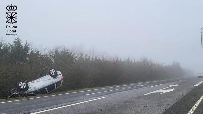 El accidente se ha registrado a las 8.15 horas de este domingo. El conductor, que ha sido trasladado al hospital, ha sido imputado por dar una tasa de alcoholemia penal (0,69) y positivo indiciario en speed, según ha informado la Policía Foral.