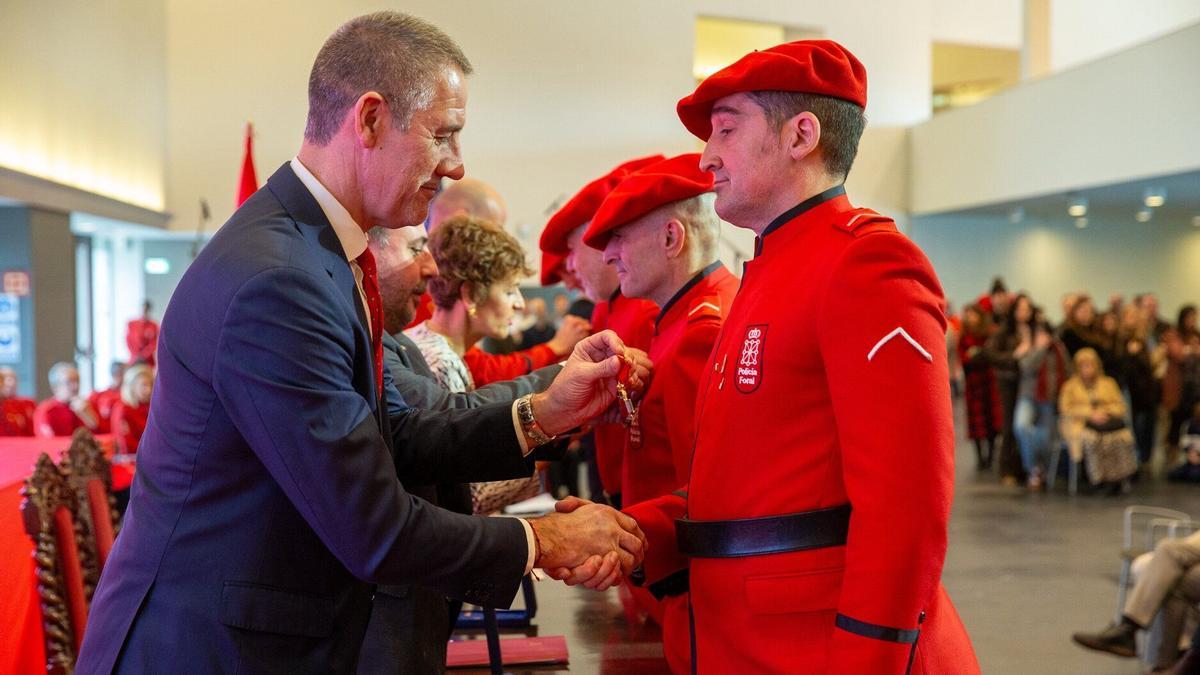 El policía foral aceleró el paso por la acera al escuchar unos gritos y un cierto tumulto de gente. “Veía una discusión acalorada y un forcejeo entre dos personal. Conforme me iba acercando, veía que el asunto era grave y empezaba a tomar un cariz que no me gustó nada”, recuerda el homenajeado. César observó cómo un hombre portaba un cuchillo cebollero en su mano y acometía contra la víctima. “Hacía ademán para pinchar a la mujer en el abdomen, ella se zafaba pero él seguía erre con erre. Fue cuando dejé todo lo que llevaba encima e intenté actuar con seguridad. Lo inmovilicé, le quité el cuchillo y me puse en posición de seguridad. Alguien había telefoneado ya a SOS Navarra y la mujer estaba tumbada en el suelo, con una hemorragia y varios transeúntes intentaban taponarle la herida con pañuelos”.