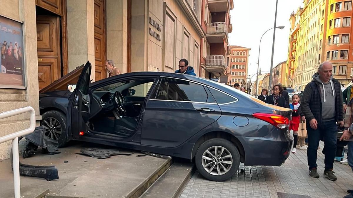 Un turismo fuera de control ha provocado en la tarde de este martes un gran susto en el entorno del colegio San Ignacio-Jesuitas de Pamplona. El vehículo se ha subido a la acera y ha chocado contra la puerta de la iglesia.