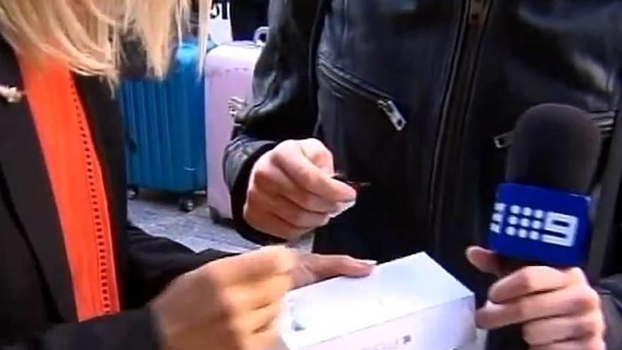 Llevaba horas haciendo cola y se convirtió en la primera persona del mundo en comprar el nuevo Iphone 6. Sin embargo, su alegría cesó de inmediato cuando una reportera le pidió que se lo enseñara. Con los nervios a flor de piel, el chico, al abrir la caja, se le cayó el móvil ante el asombro de todos.